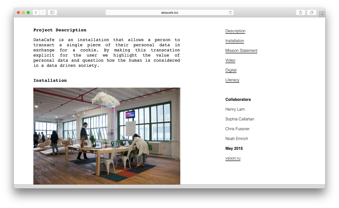 The Data Cafe highlights the value of person data through a simple transaction. In order to visualize the invisible, the interactive installation shows the direct relation between data and monetary value through a user experience that solicits literal steps of data creation and exchange.